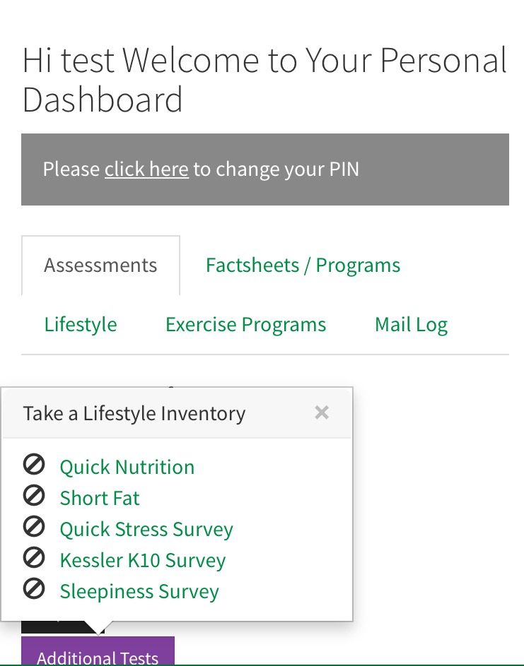 The subject dashboard is a secure web session that allows the subject to review their current historical reports, take additional self assessments such as sleep , nutrition and stress. The Dashboard also holds weight and lifestyle tracker and gives access to recommended fact sheets and self help programmes.